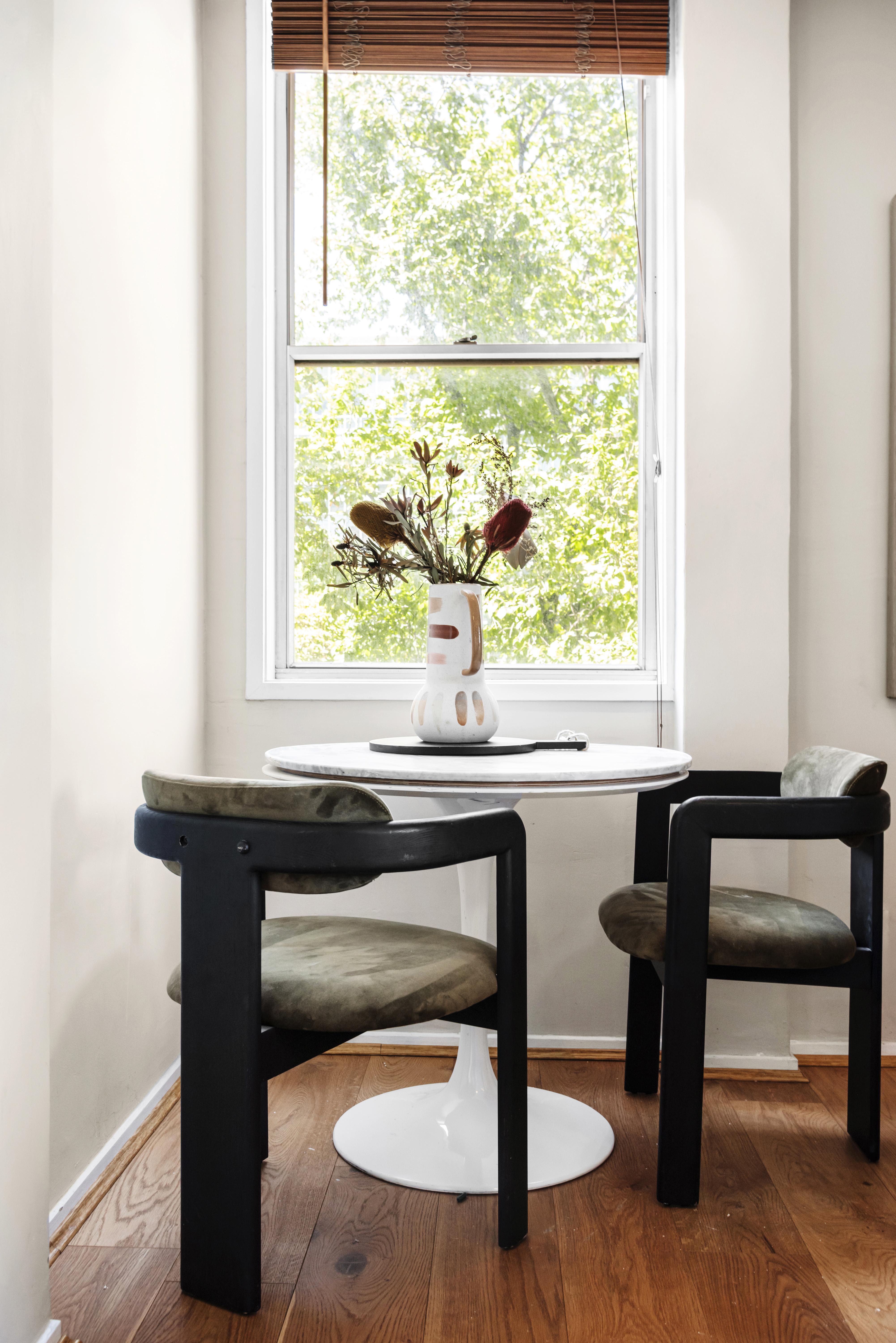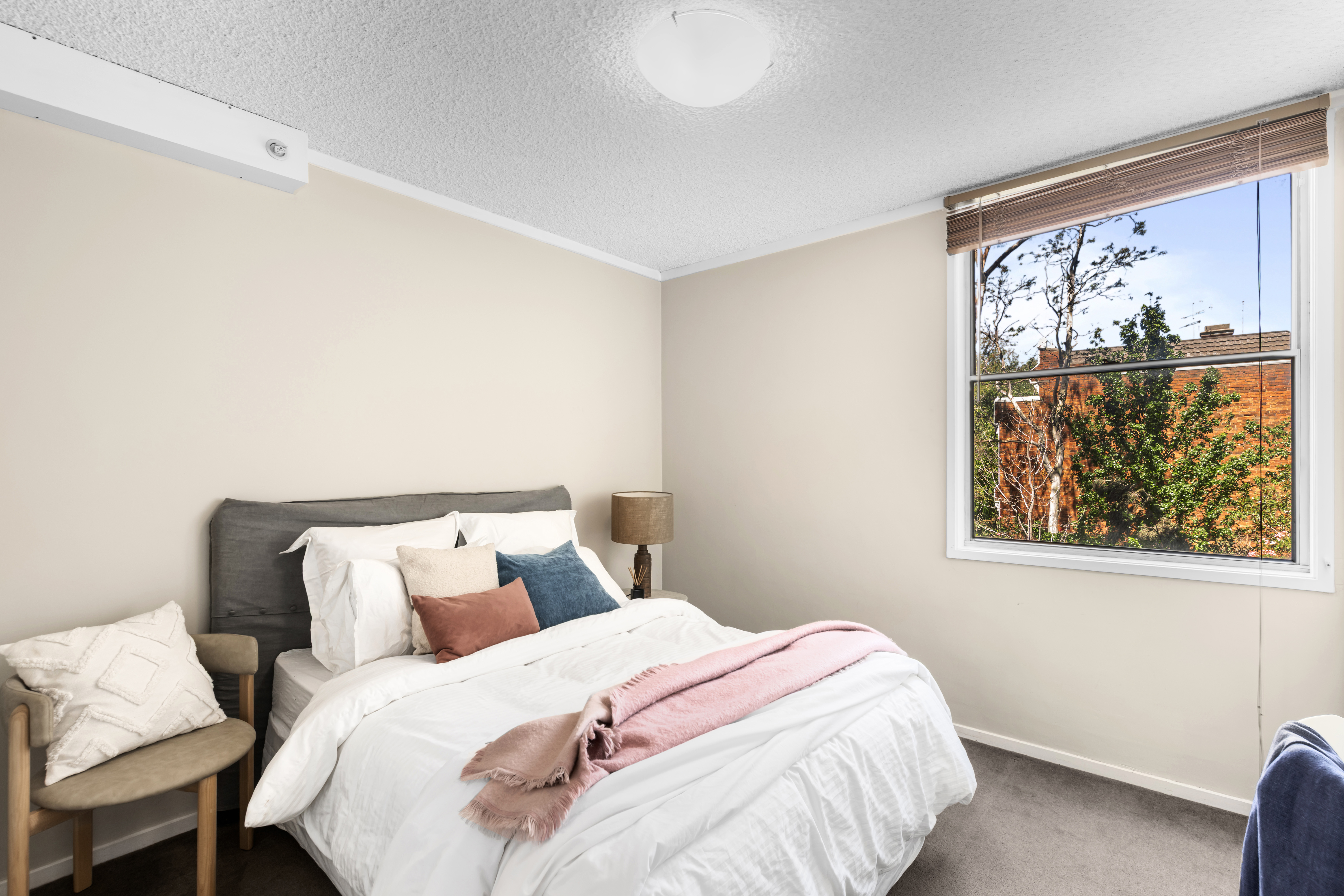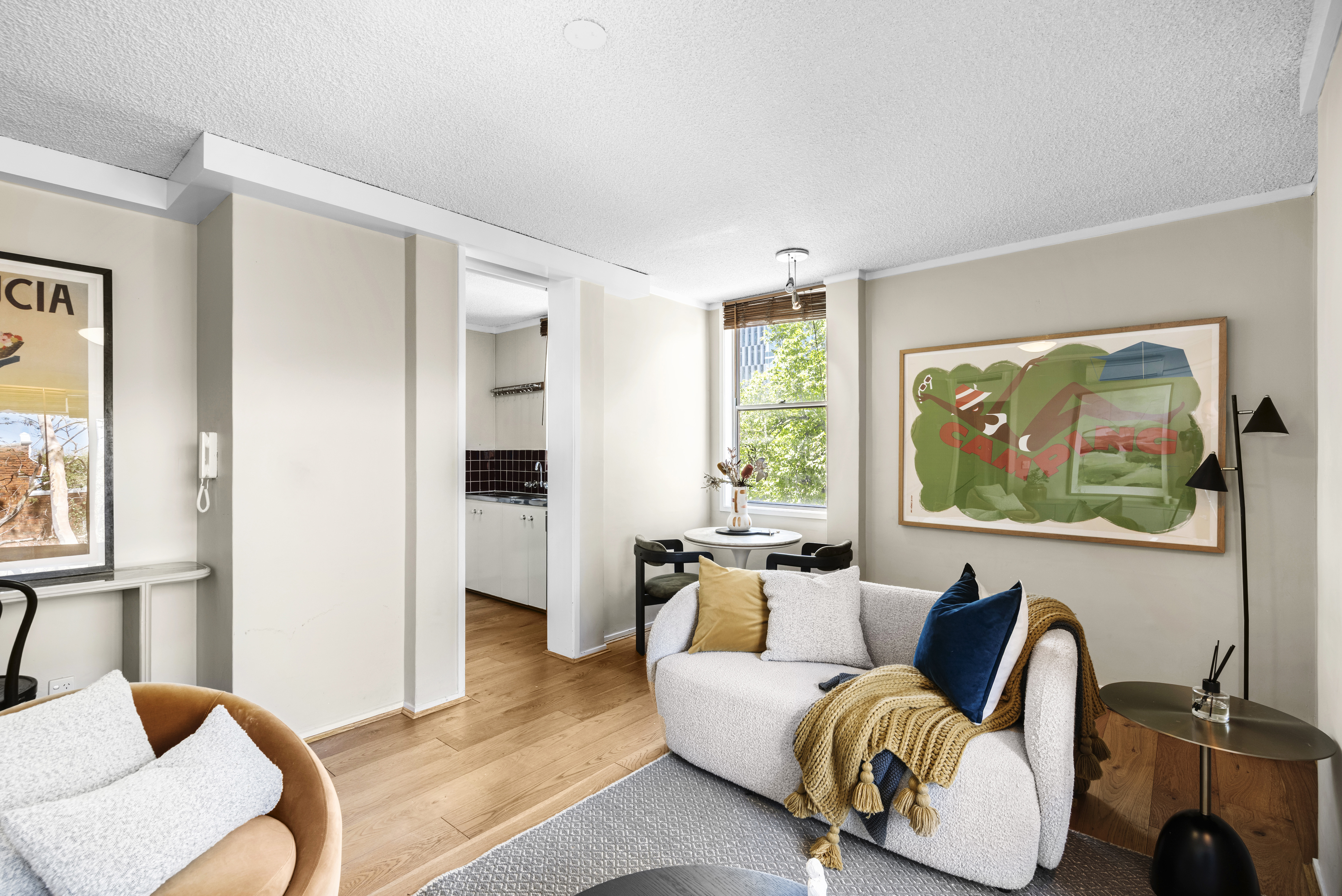 Positioned on a lower level within the building, the apartment sits comfortably among established trees, softening the urban setting and enhancing privacy.